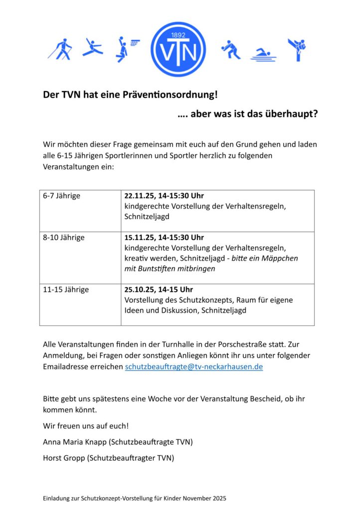 Alle Veranstaltungen finden in der Turnhalle in der Porschestraße statt. Zur  Anmeldung, bei Fragen oder sonstigen Anliegen könnt ihr uns unter folgender Emailadresse erreichen: schutzbeaufragte@tv-neckarhausen.de