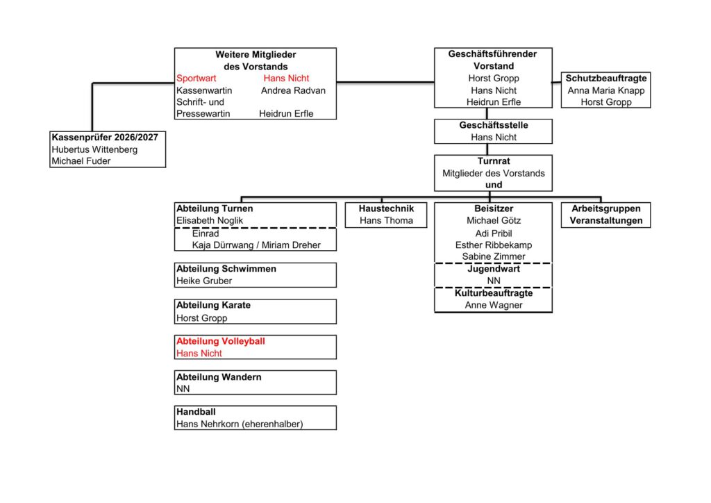 Zum Gesamtvorstand nach § 9 der Satzung vom 19. April 2024 gehören neben den Mitgliedern des geschäftsführenden Vorstands noch die Kassenwartin Andrea Radvan, der Sportwart Mario Scheibel, die Schriftwartin und Pressewartin Heidrun Erfle (auch im geschäftsführenden Vorstand) sowie die beiden Schutzbeauftragten Anna Maria Knapp und Horst Gropp (auch im geschäftsführenden Vorstand).