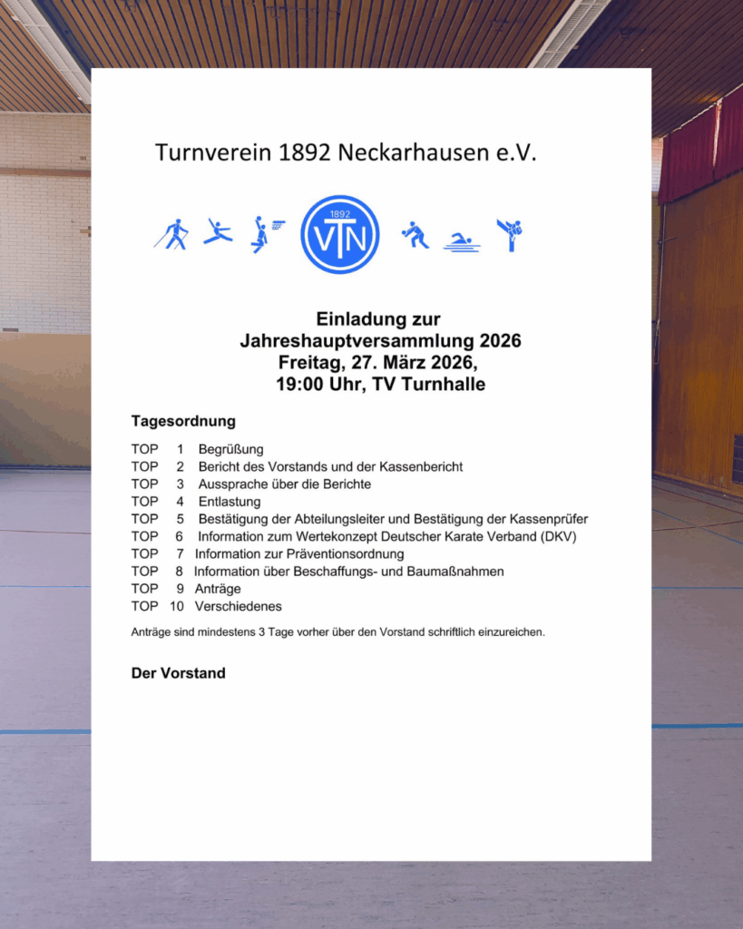 Wir laden alle Mitglieder und Freunde des Turnvereins 1892 Neckarhausen zu unserer jährlichen Jahreshauptversammlung ein.